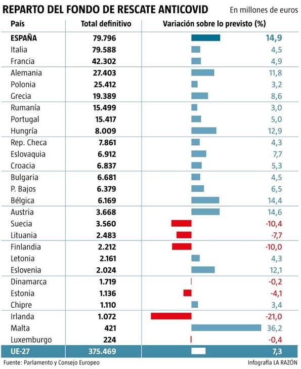 Esto supone un incremento de más de 10.000 millones si se compara con los 69.437 millones prometidos con anterioridad por la Unión Europea. Es decir, un 15% más de ayudas directas. De esta forma, España se convierte en el Estado más beneficiado por el fondo de reconstrucción comunitario, por encima de Italia que lideraba el ranking hasta el momento. En el mes de noviembre, la Comisión Europea situó a nuestro país como el más afectado por el coronavirus y vaticinaba una contracción récord del 12,4%, visiblemente por encima del 10,9% calculado en verano.
