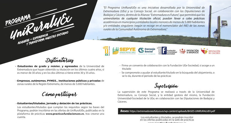 UniRuralUEx es un programa de prácticas muy interesante para empresas e instituciones y que permitirá a los estudiantes de Grado o Master llevar a cabo sus prácticas académicas en vuestros municipios.