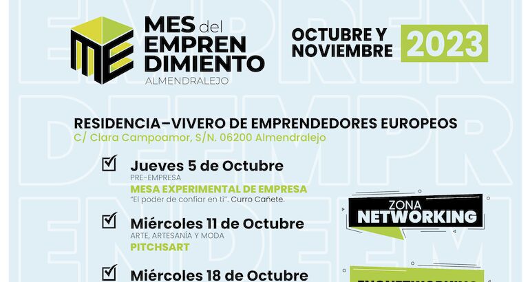 Nos ponemos en contacto con usted para invitarle junto con su equipo, al evento del Mes de Emprendimiento-2023 que el Excmo. Ayuntamiento, a través del Espacio Global de Emprendimiento (EGE) ha puesto en marcha con el objetivo de potenciar ideas, generar oportunidades de negocio y fomentar la cultura emprendedora en Almendralejo, pensado únicamente para vosotros.