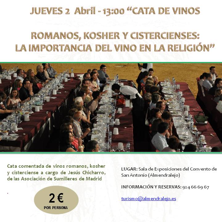 El jueves 2 de abril tendrá lugar a las 13:00 horas una cata comentada de vinos romanos, kosher y cisterciense a cargo de Jesús Chicharro, de la Asociación de Sumilleres de Madrid. El lugar será la Sala de Exposiciones del Convento de San Antonio (Almendralejo). El precios erá de 2€ por persona. Para más información y reservas: 924 666 967.